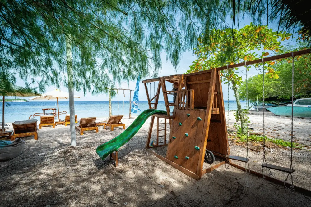 Our small playground is safely located close to the seating areas, allowing parents to relax while kids have fun in the sand. With no motorbikes on the island, it’s a safe and easy space for children to explore.